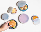 Our new mealtime mix and match collection is both fun and functional. Meal sets come with a bowl and lid that double as a bowl and plate, making them ready for delicious treats at home or on the go. Soft to the touch, the plastic-free meal set is perfect for everyone!