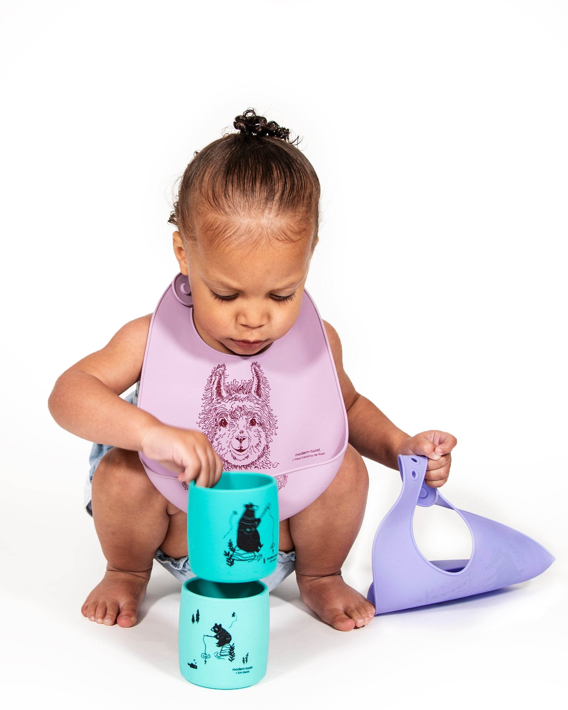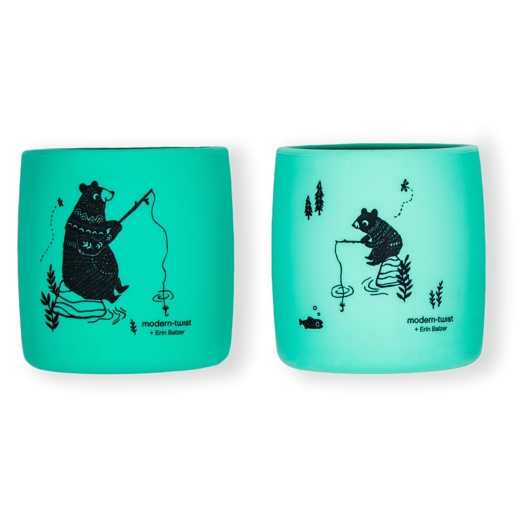 Our new mealtime mix and match collection is both fun and functional. Adorable graphics by Erin Balzer, soft to the touch, mix and match the forest family collection. Sip sets come with two cups. Each cup has an adult on one and child on the other. Each cup is easy to hold and makes plastic cups a thing of the past.