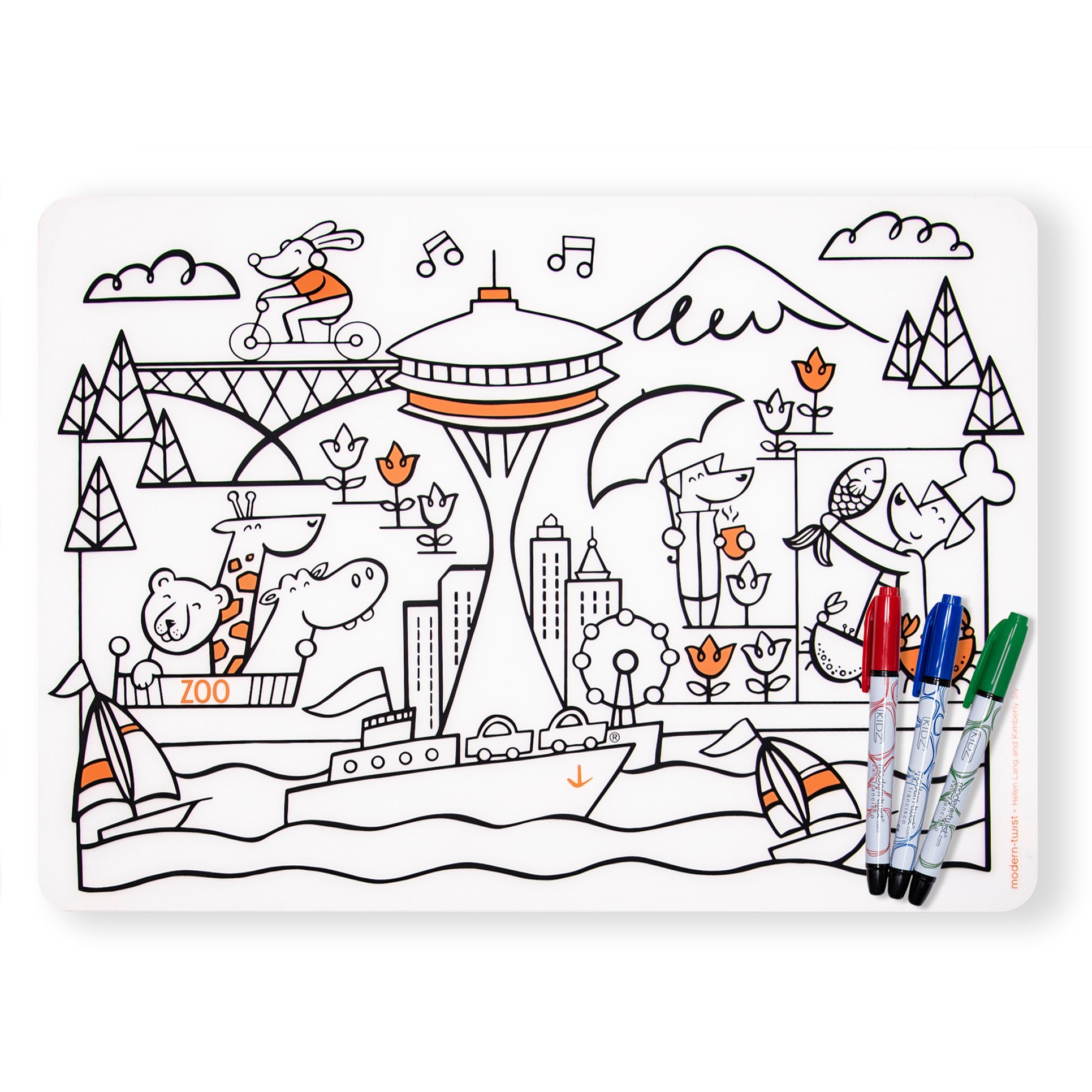 The plastic-free mark-mat is crafted out of pure, silky soft silicone & designed for kids of all ages. Young Picassos will love the playful designs & enchanting characters that adorn our mats, from a whimsical day of Fun on the Golden Gate to wild adventures with our fearless Space Animals. The non-porous & germ-free surface will never wear & tear, so you can roll up the reusable, memory-free mat again & again for endless mealtime fun at home or on the go. Keep the harsh chemicals found in plastics & lower-grade silicones away from your family & out of our landfills with the easy to clean, playful mark-mat series.