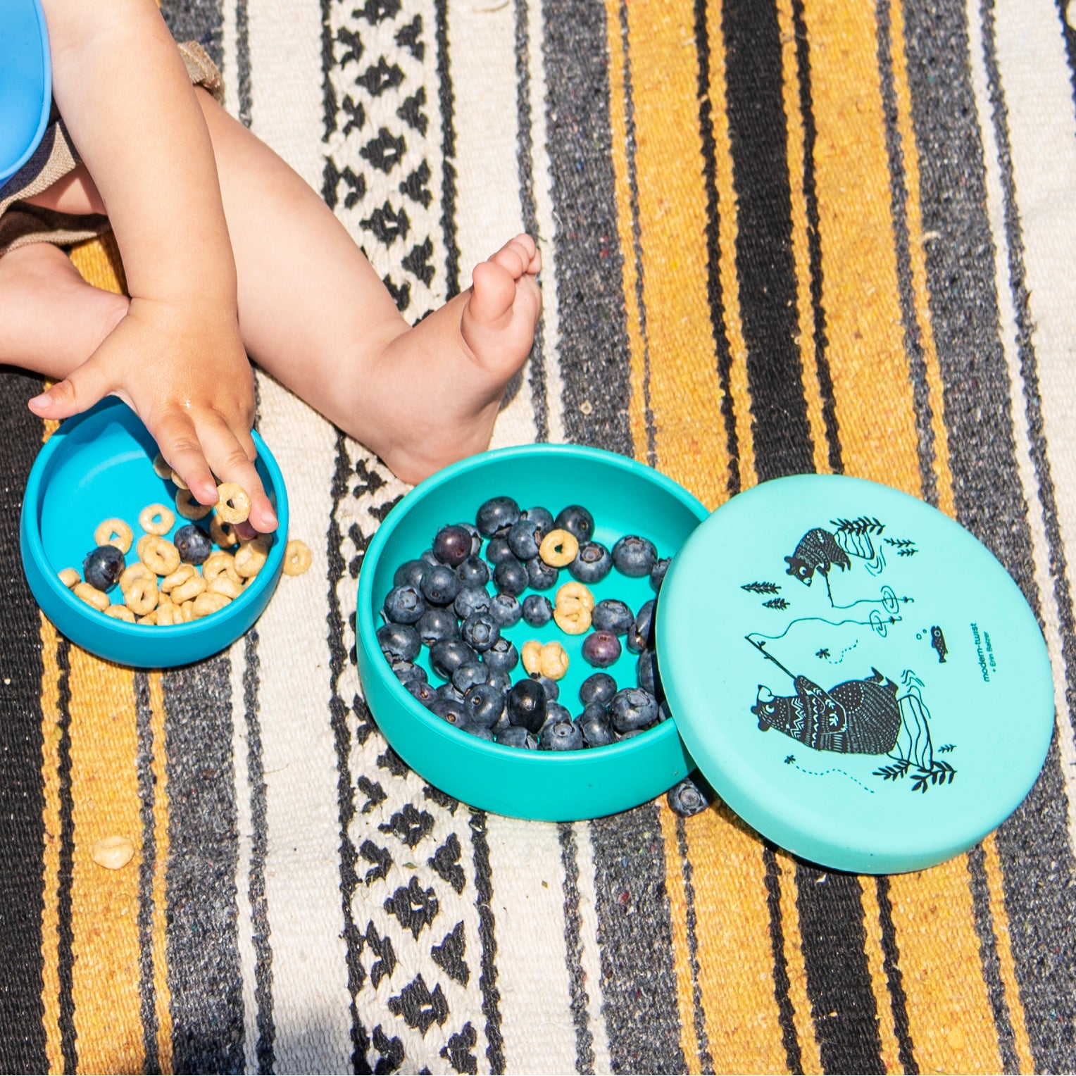 Our new mealtime mix and match collection is both fun and functional. Adorable graphics by Erin Balzer, soft to the touch, mix and match the forest family collection. Meal sets come with a food bowl and lid that doubles as a plate. The plastic-free meal set is perfect for little hands!