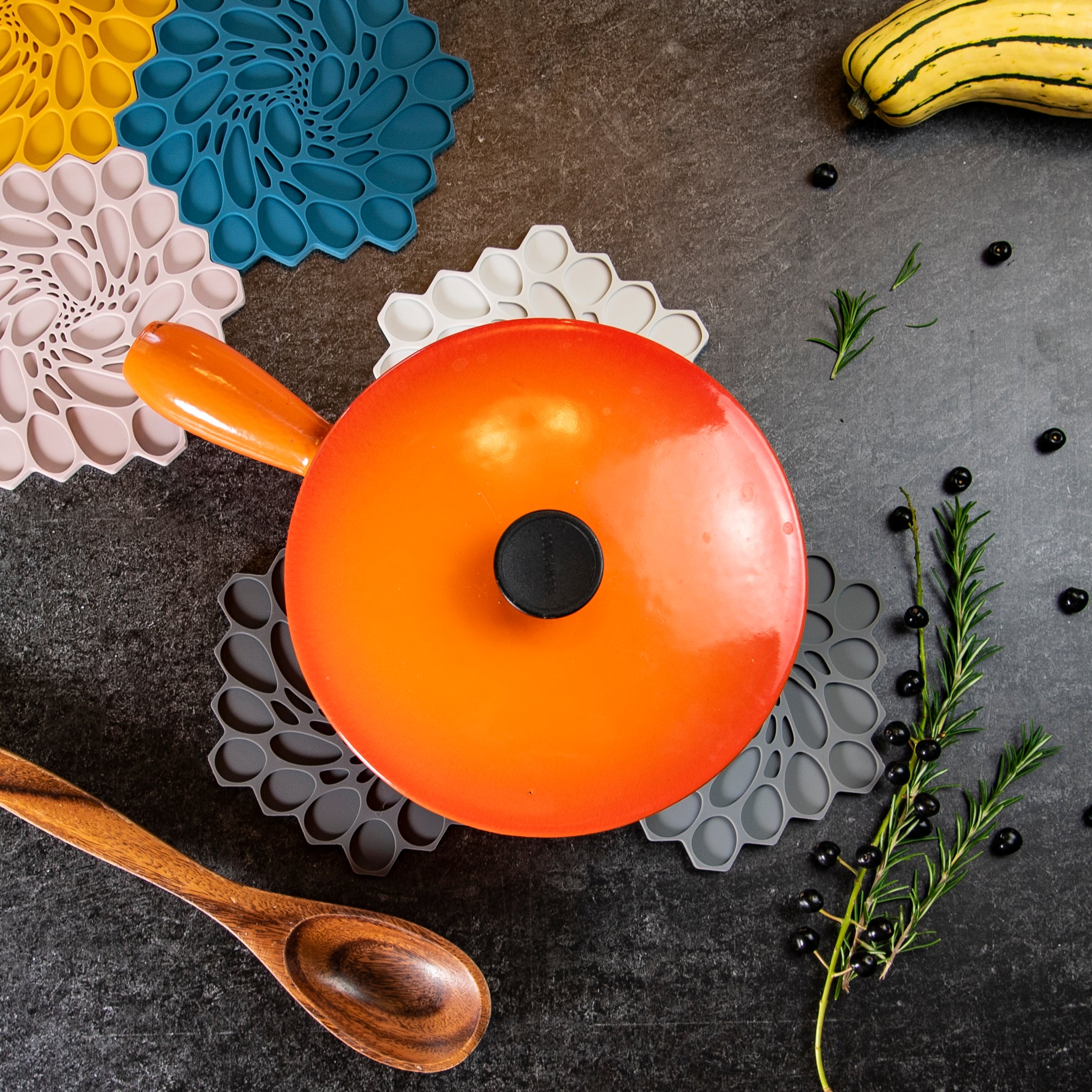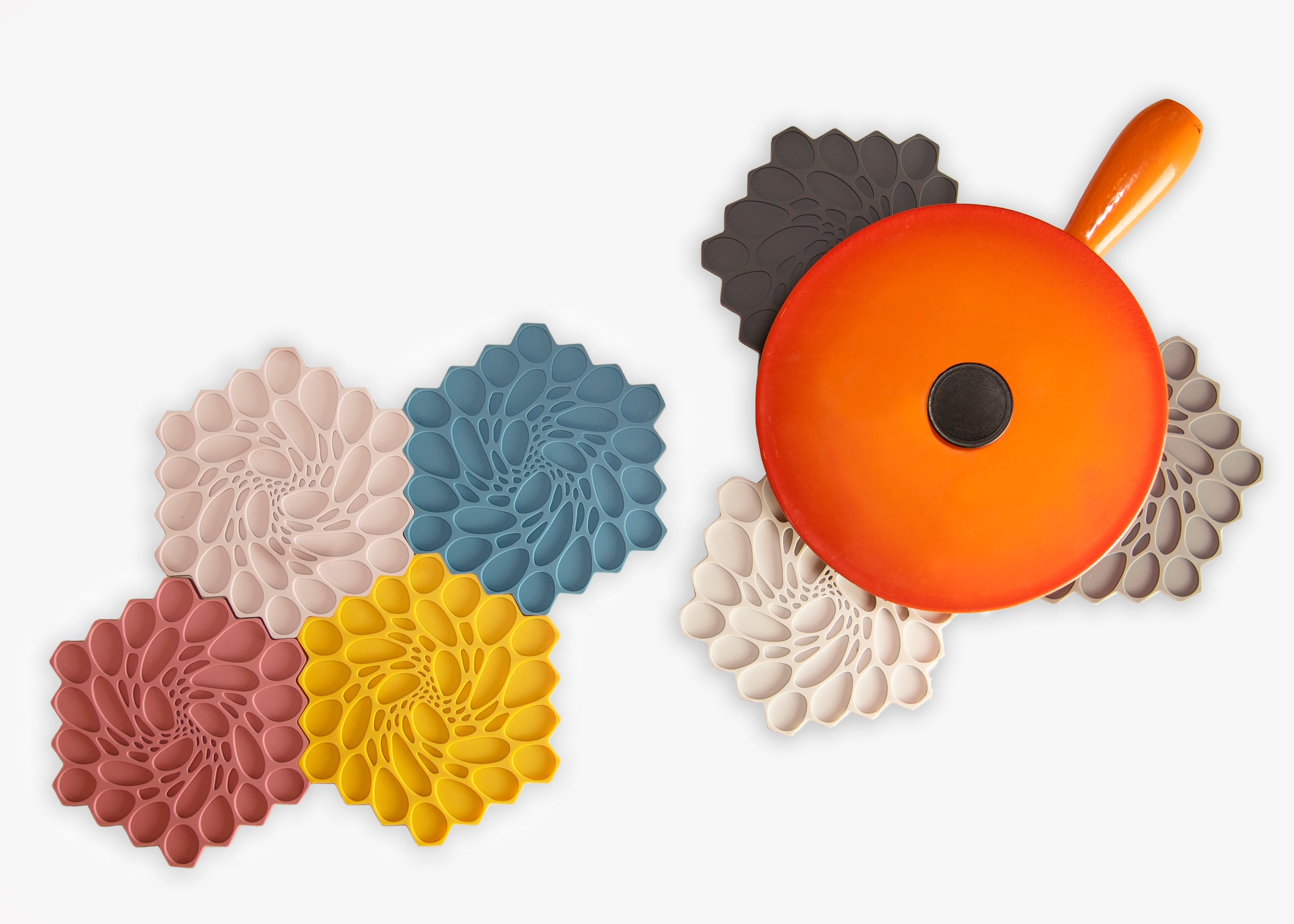 Designed in collaboration with Nervous System our plastic-free silicone delivers eco-friendly elegant style to your home. Our trivets protect your surfaces from heat damage by pots and pans with silky soft, memory-free silicone that never wears or tears. Designed to connect together to form any sized protective surface that you need. They also make a great table runner or centerpiece. Bring functional elegance to your kitchen keeping lead, latex, phthalates, BPAs, & other harsh chemicals far away from your dinner. The non-porous & germ-free material repels the biggest spills & wipes clean with ease, leaving you free to enjoy the subtle designs & rich colors for many years to come.