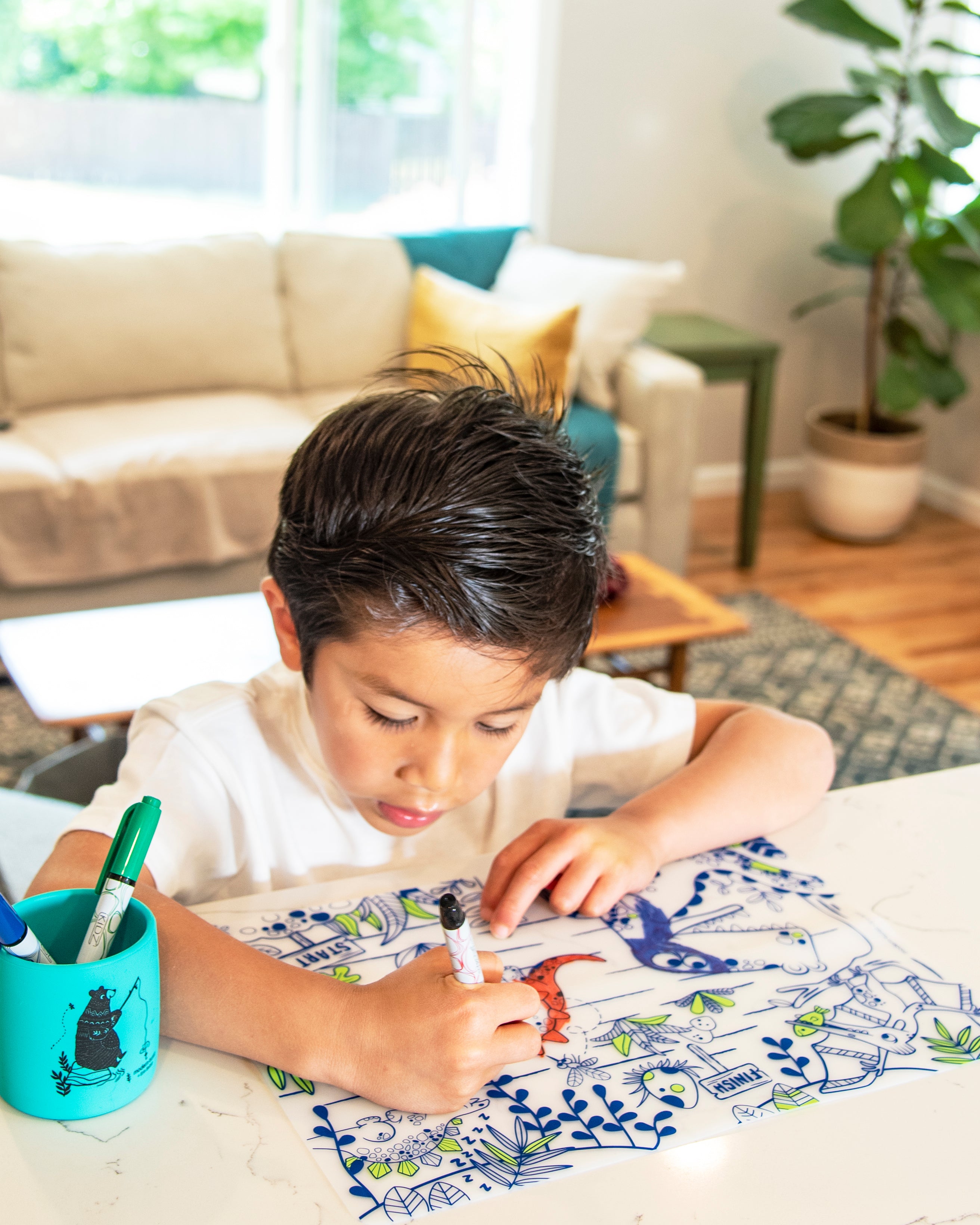 The plastic-free modern-twist mark-mat is crafted out of pure, silky soft silicone & designed for kids of all ages. Young Picassos will love the playful designs & enchanting characters that adorn our mats, from a whimsical day of Fun on the Golden Gate to wild adventures with our fearless Space Animals. The non-porous & germ-free surface will never wear & tear, so you can roll up the reusable, memory-free mat again & again for endless mealtime fun at home or on the go. Keep the harsh chemicals found in plastics & lower-grade silicones away from your family & out of our landfills with the easy to clean, playful mark-mat series.