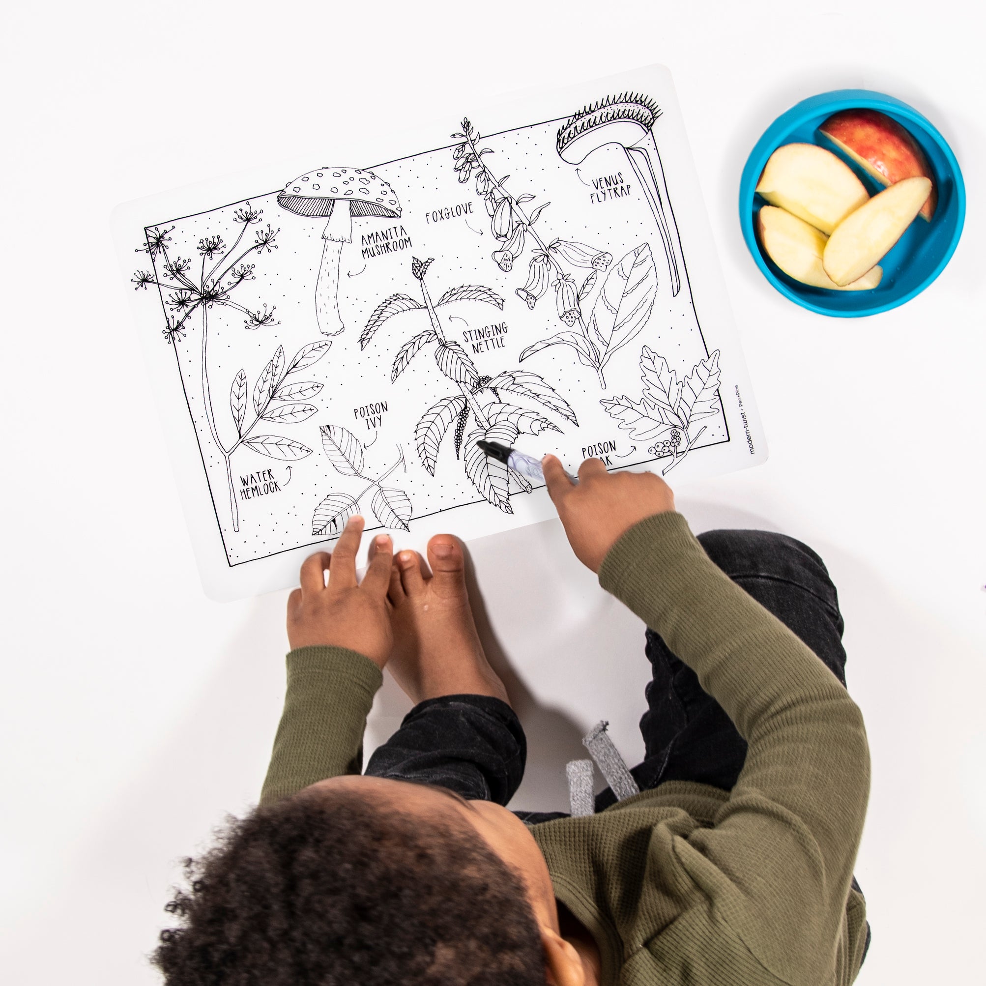 CARE: We’ve kept harsh chemical coatings off of all modern-twist products to keep you healthy & safe. Make sure to clean spills promptly to avoid staining your mark-mat & avoid punctures by keeping it away from sharp objects! Although all of our products are heat resistant to 250 Celsius or 425 Fahrenheit, we do not recommend using them as trivets.