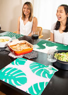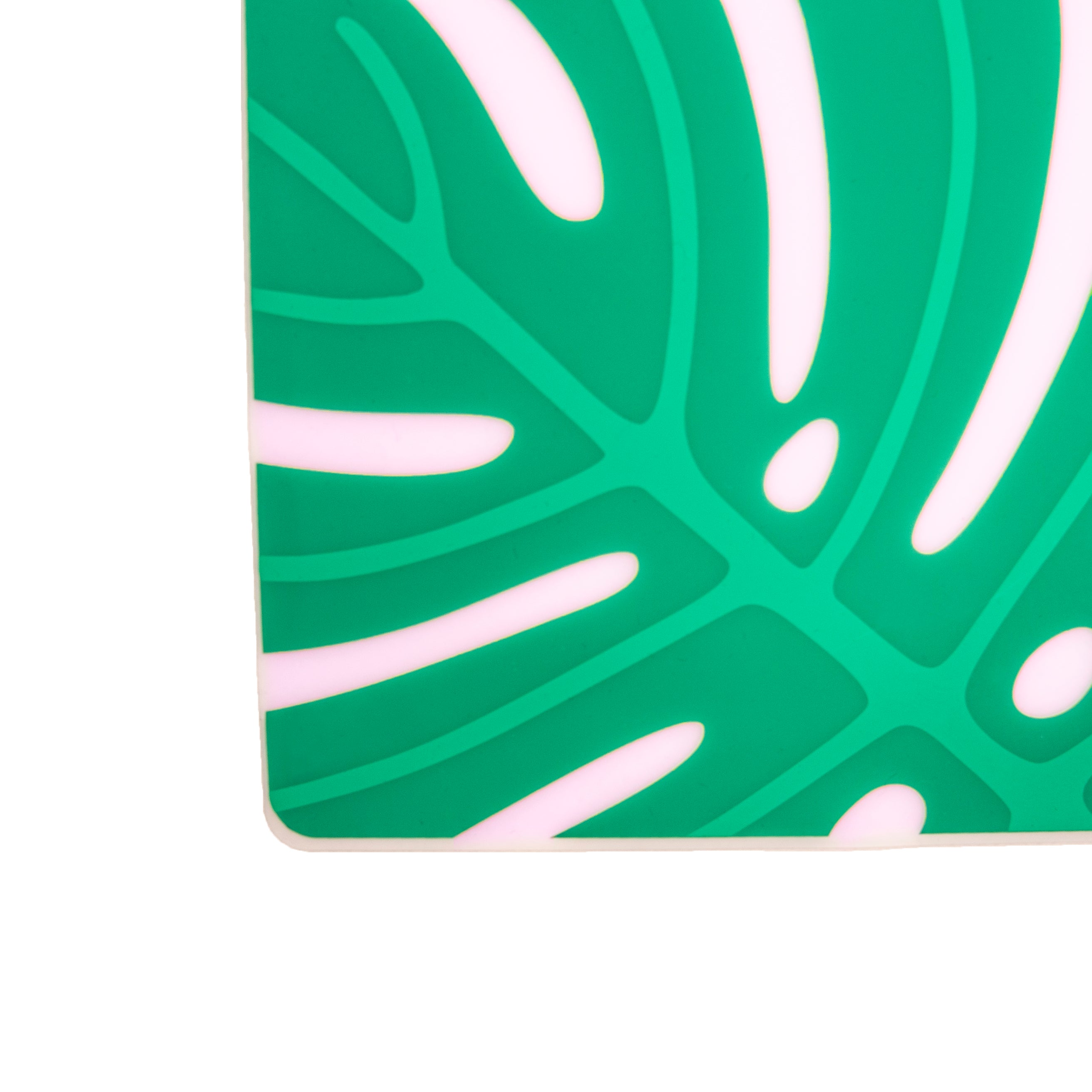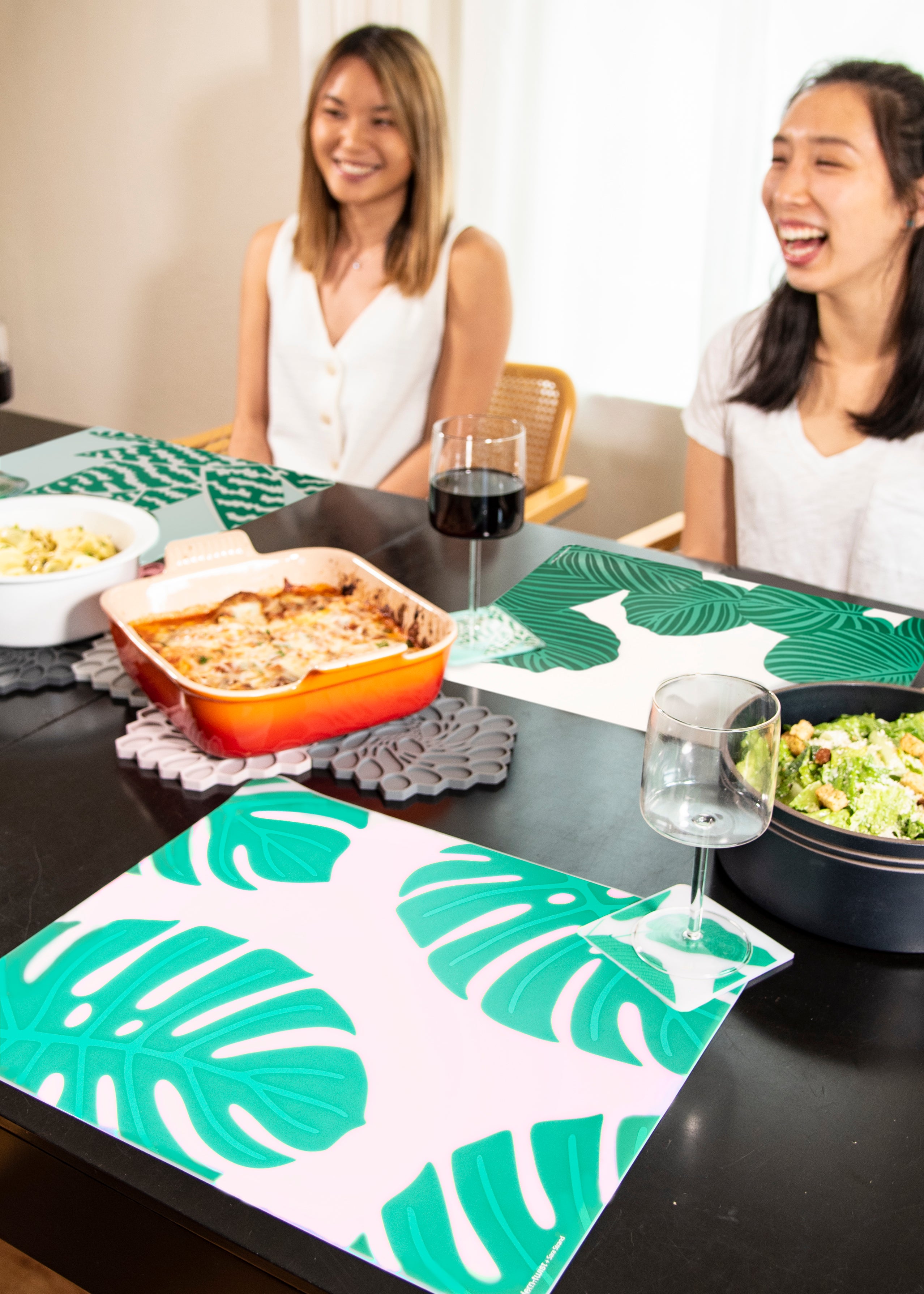 Made from plastic-free silicone & hand silk-screened with nature-inspired designs, the modern-twist monstera deliciosa placemat delivers eco-friendly, elegant style to your home. Bring botanical beauty to your table with this soft, beautifully translucent pattern that enhances any surface while keeping lead, latex, phthalates, BPAs, & other harsh chemicals far away from your dinner. This forgiving placemat protects your surfaces from heat & water damage with silky soft, memory-free silicone that never wears or tears. The non-porous & germ-free material repels the biggest spills & wipes clean with ease, leaving you free to enjoy the subtle designs & rich colors for many years to come.