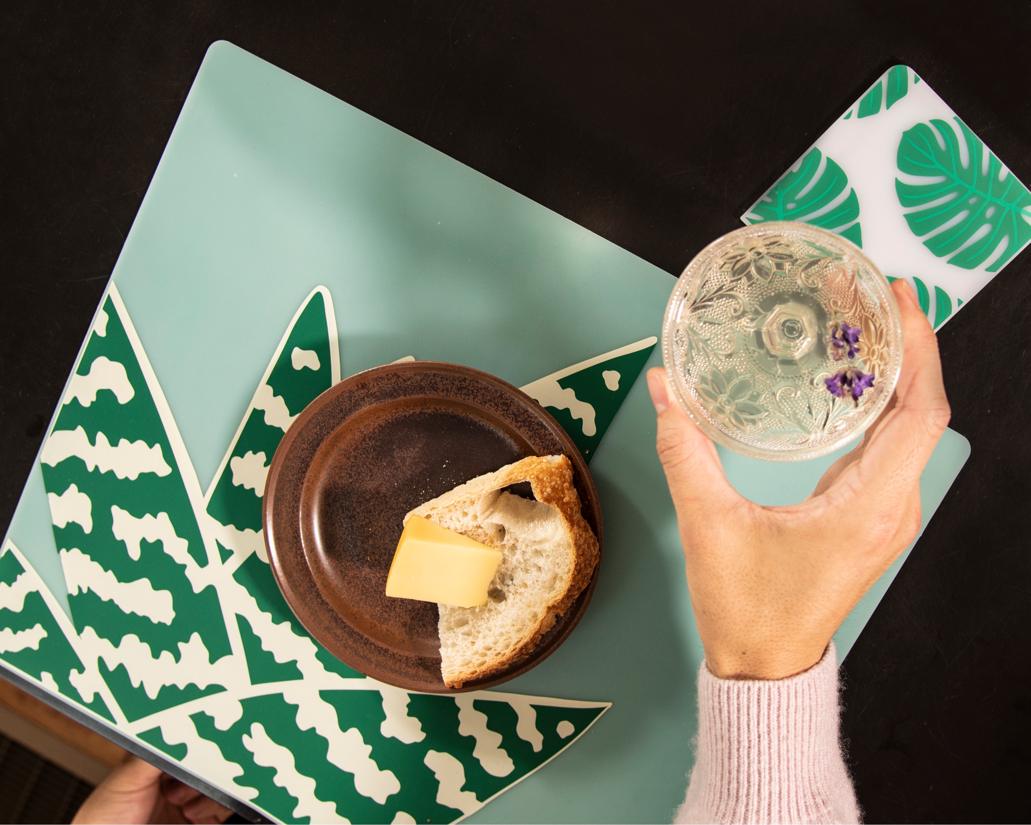 Made from plastic-free silicone & hand silk-screened with nature-inspired designs, the modern-twist tiger aloe placemat delivers eco-friendly, elegant style to your home. Bring botanical beauty to your table with this soft, beautifully translucent pattern that enhances any surface while keeping lead, latex, phthalates, BPAs, & other harsh chemicals far away from your dinner. This forgiving placemat protects your surfaces from heat & water damage with silky soft, memory-free silicone that never wears or tears. The non-porous & germ-free material repels the biggest spills & wipes clean with ease, leaving you free to enjoy the subtle designs & rich colors for many years to come.