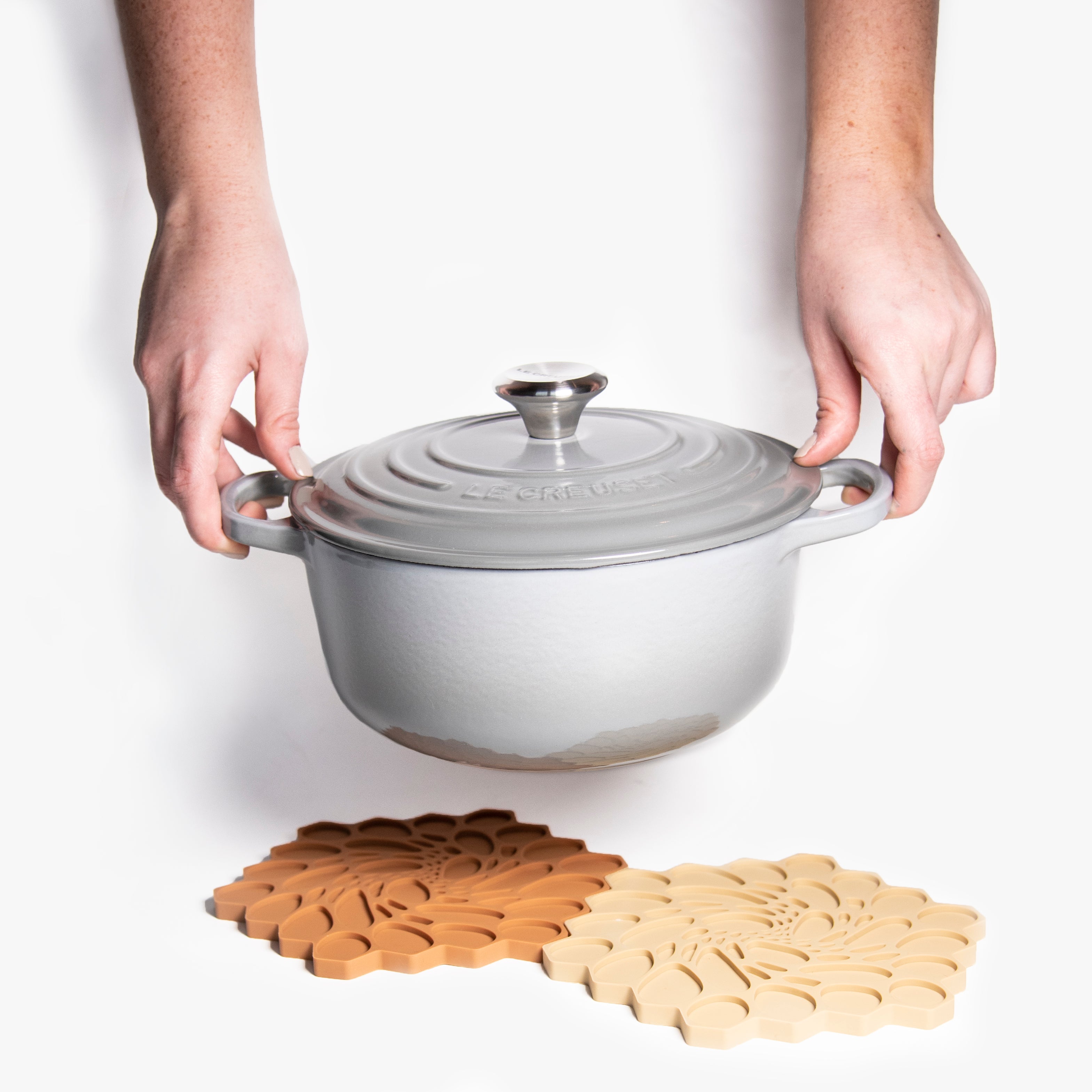 Designed in collaboration with Nervous System our plastic-free silicone delivers eco-friendly elegant style to your home. Our trivets protect your surfaces from heat damage by pots and pans with silky soft, memory-free silicone that never wears or tears. Designed to connect together to form any sized protective surface that you need. They also make a great table runner or centerpiece. Bring functional elegance to your kitchen keeping lead, latex, phthalates, BPAs, & other harsh chemicals far away from your dinner. The non-porous & germ-free material repels the biggest spills & wipes clean with ease, leaving you free to enjoy the subtle designs & rich colors for many years to come.